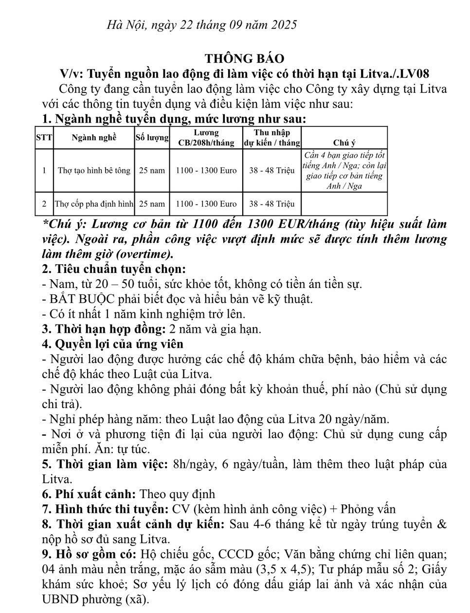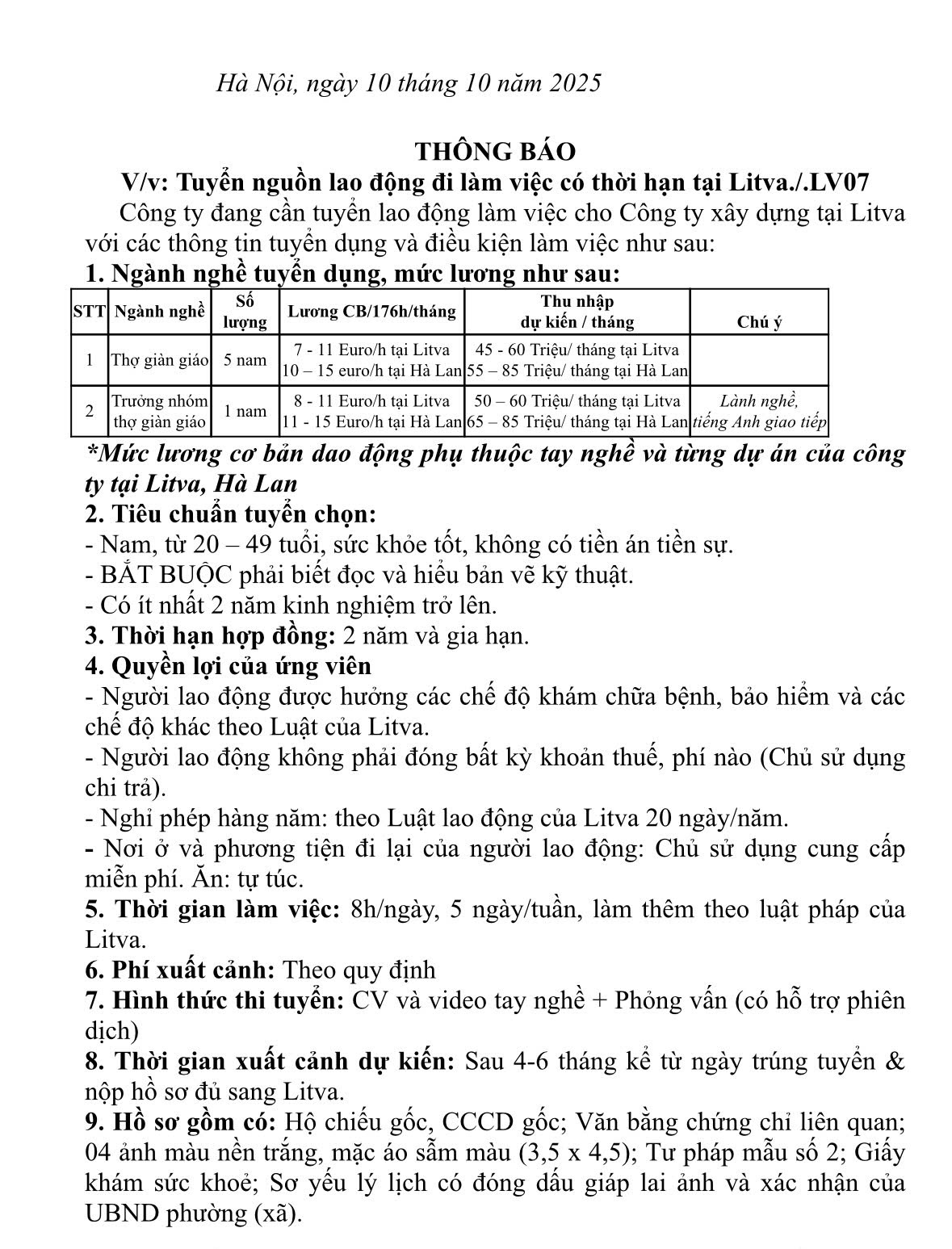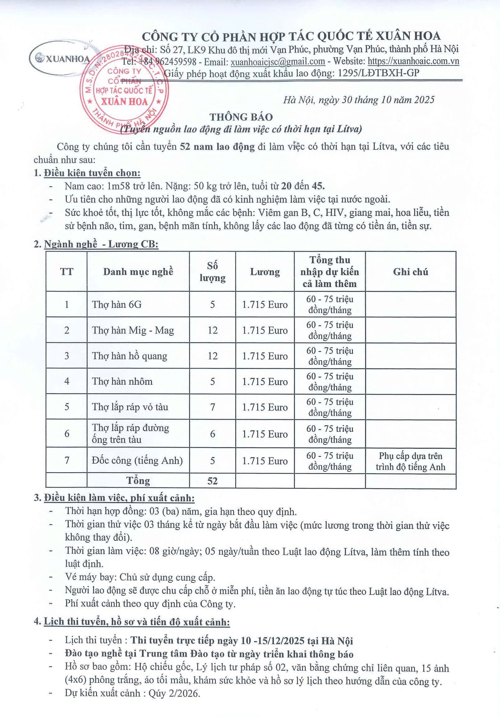 2. Tiêu chuẩn tuyển chọn: Xuất khẩu lao động Litva