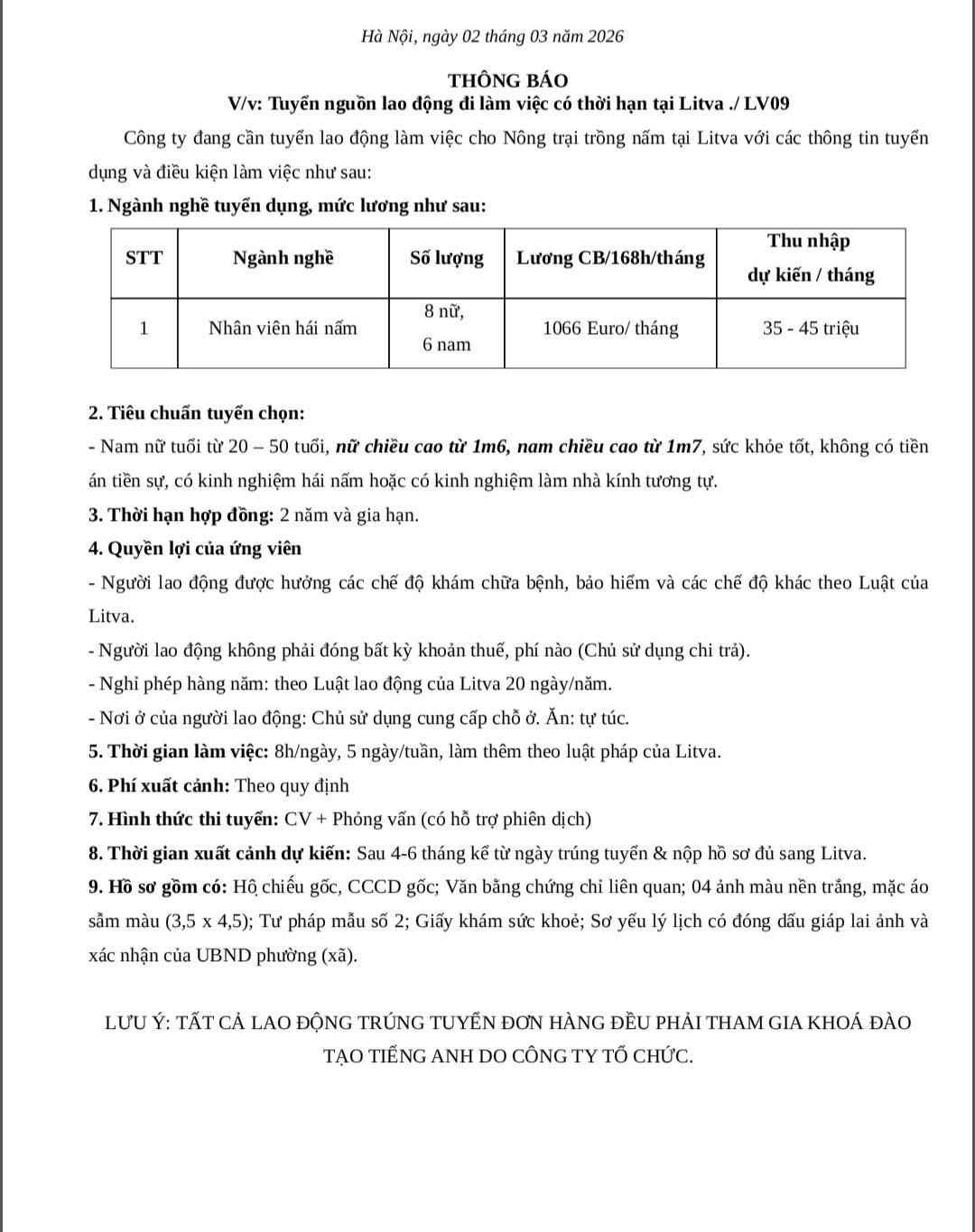 2. Tiêu chuẩn tuyển chọn: Xuất khẩu lao động Litva