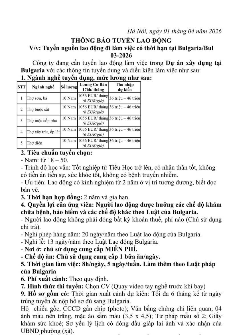8. Thời gian xuất cảnh dự kiến: từ 4 – 6 tháng kể từ ngày trúng tuyển và nộp hồ sơ sang Bulgari.